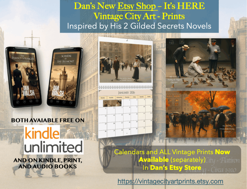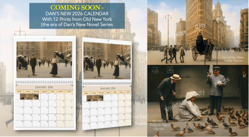 COMING SOON – DAN’S NEW CALENDAR INSPIRED BY NEW NOVEL SERIES – I’ve been working on this since I finished writing my Newest Novel, Scandal At The Belmont. I spent so much time living back in old New York City, near the end of the Gilded age, I decided–with the help of AI–to try to give you all a sense …
