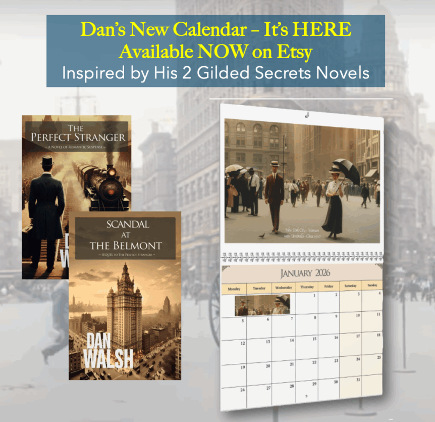 This beautiful calendar was designed by Dan, inspired by all the months he spent researching his last 2 novels. Both books are set in old New York during the end of the “Gilded Age,” in 1912 and 1914. In fact, Dan called them “The Gilded Secrets Series.” The books are “The Perfect Stranger” and “Scandal At The Belmont ” (available …