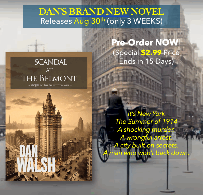 ⭐🔷⭐ DAN’S NEW NOVEL RELEASES IN 3 WEEKS – (but $2.99 price Ends in 15 Days). Dan’s Newest Novel — Scandal At The Belmont — Releases Aug 30th (Labor Day Weekend). It’s Available to Pre-Order NOW on Amazon, and it’s ALREADY RECEIVED its first Official Review. It came from Jann Martin (a fine author, part of my Proofreading Team). “Dan, you did it again. I …