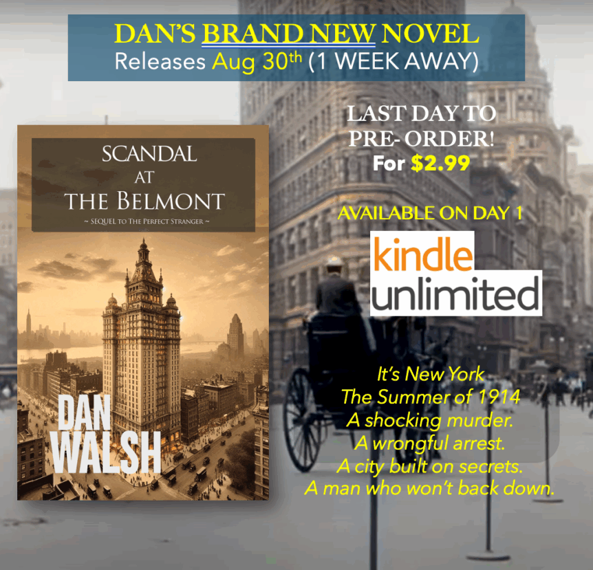 ⭐🔷⭐ DAN’S NEW NOVEL RELEASES IN 1 WEEK – (LAST DAY AT $2.99). Dan’s Newest Novel — Scandal At The Belmont — Releases Aug 30th (Labor Day Weekend). Available to Pre-Order NOW on Amazon. NOTE: Will be available on KU from Day 1. Click the LINK below to Pre-Order. CLICK the 2nd LINK to get a SNEAK PEEK of the First Few Chapters. https://www.amazon.com/dp/B0FGVRQ8C9 SNEAK PEEK, …